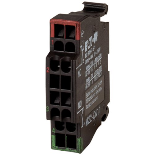 Standard/Approval for Contact Element: UL/CSA, IEC, Construction Size: NZM1/2/3/4. Methods of Connection: Cage Clamp, Fastening Method: Front Fastening, Description: In case of utilising Emergency Activation Device M22-PV... Max. 2 Contact Elements = 4 NC/ N/O Contacts. Cage Clamp is a registered trademark of Wago Kontakttechnik GmbH/Minden, Germany. N/C Contacts = Normally Closed: 2 NC.